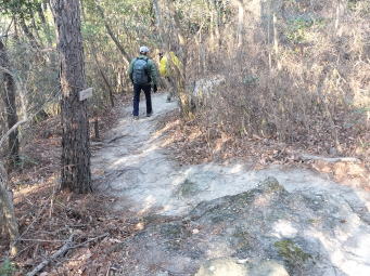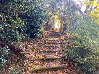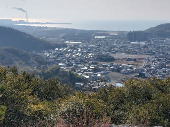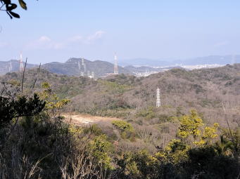 多くの枯葉が道を覆っている雑木林の中を登り返すと分岐があり、直進は栄谷山を避ける巻道、右に折れて登って行くと次の山「栄谷山」となる。ここにはベンチが置かれているが雑木林に囲まれて展望はもう一つ。下ると先ほどの巻道に合流してから直ぐに南北を結ぶ切り通しの峠道に出会う。右はやはり「大鳥」へ、左は的形市街へ。ここを左折してすぐに右折で横切り、登って行くと本日3つ目の「大日山」の頂上となる。頂上には休憩所があり、やはり瀬戸内海方面の視界が広がっている。
