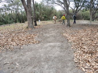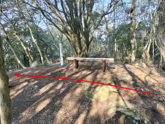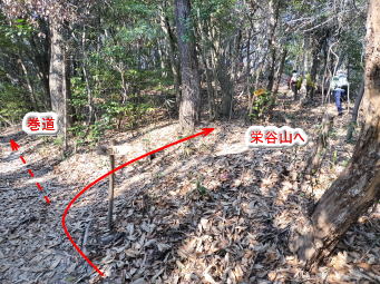 | 栄谷山へ緩やかに下って行く→ | 枯葉で覆われた栄谷山への登り→ | ベンチがある ②栄谷山頂上→ |