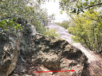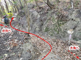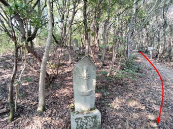 | 切り通し峠道の分岐に出会う→ | 休憩所のある ③大日山頂上→ | 峠道で青の山の方面の右に折れるへ向かう→ |