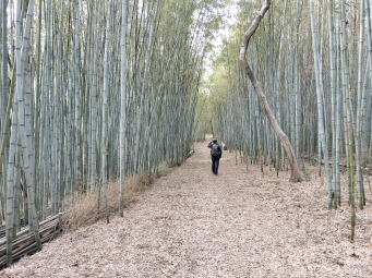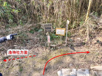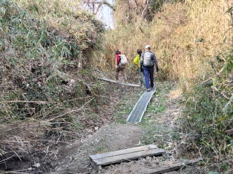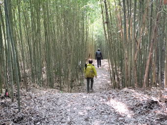 | 国道250号線を横切り、反対側の山へ→ | グレーティングが敷かれた笹藪の中を→ | 度々竹林の中を抜けて→ |