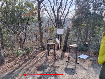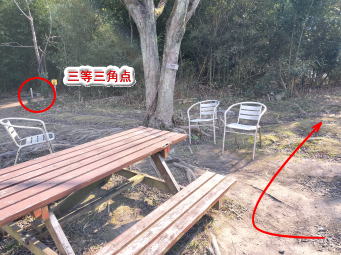 来た道を戻り、更に下ると国道250号線に出会う。道路反対側には登山案内板が見えるので国道を横切り、珍しく道にグレーティングが敷いてあり笹藪、続いて竹林の中を抜けて更に鎖場があるスラブを乗り越えていく。#15鉄塔を通過するとすぐ先に「高坪山(たかつぼやま)」頂上。テーブルと椅子があるので一休み。点名:的形の三等三角点はその横にある。展望は北側のみで姫路バイパス、その奥に小富士山、仁寿山が望める。