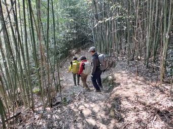 的形アルプスは地元の人々「的形ふるさと里山会」の努力により、山道は良く整備されて案内標識にも要所々にしっかりと設置されているためスマホのナビに頼らなくとも歩き易い。またコース上のあちこちの木々には木の銘板が掲げられているので歩く距離を調整すればファミリーハイキングに適している。ここの山々にはあちこちに竹林が在り、竹で囲まれた中の歩きは風による竹の心地良い打音と共にトンネル状の道が雰囲気を醸し出している。今回のコースは距離が10Kmの予定であったが小赤壁遊歩道を通り抜けることができなかったので迂回した分が増えて12Kmと長丁場となり、獲得標高は少ないにもかかわらず結構、疲れた😫。