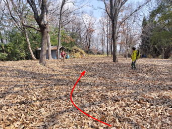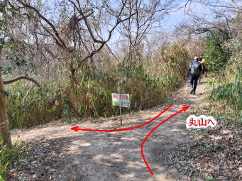 | 分岐を右に折れて丸山を目指す→ | #16鉄塔を左に見る→ | 枯葉で覆われた広場の ⑥丸山頂上→ |
