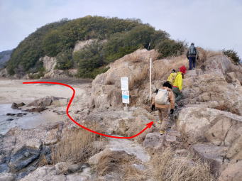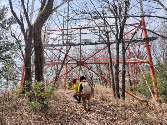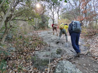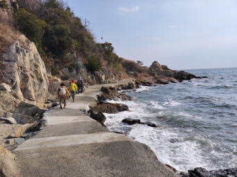 「木庭山(きにわやま)」に到着。東屋や展望台の下は既に他の登山者が休まれている。強くなってきた西風を避けるために西側にある「木庭神社」の軒下をお借りして昼食。食事を終え、木場ヨットハーバー方面へ向かうが神社前には落石注意で通行止め🚧の表示が。しかし自己責任でそのまま歩みを進めていく。#11赤白鉄塔の下を通過して海岸に近づく辺りで崖から小石が道に転がって来ている程度で大したことも無く無事に小赤壁遊歩道に到着。