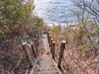 | 階段で小赤壁海岸へ下る→ | 波が荒い小赤壁海岸遊歩道→ | 八家地蔵に寄り道する→ |