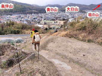 なだらかな尾根を歩いていくと本日最後の山「向山」頂上に到着。頂上は平らな台地となっている。その先の竹林の中を通り下っていくと、先ほど分かれた道と合流して畑に出会う。ここから山に囲まれた的形の街並みが見下ろせる。「海嶽寺(かいがくじ)へ」の案内に従ってドンドン下って下山。これで12座を制覇。