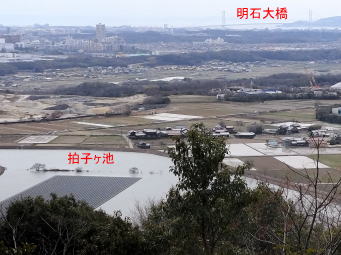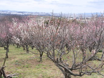 雌岡山頂上の展望台からは目の前に少し霞んではいるが神出(かんで)の田園風景と西神団地や明石海峡大橋が見ることができる。眺望を楽しんだ後、大己貴命はこの地でご生誕されてからこの地を神出と言うようになったという「神出神社」を参拝。雌岡山を制覇してから直接、「愛宕山」に向かうつもりであったが以前から訪れて見たかった「雌岡山梅林」に立ち寄るために遠回りであるが一旦、東に向かってコンクリート道をなだらかに下って行く。右側に梅林が見えてくる。広大な斜面に見頃は過ぎているもののまだ多くの紅、白の花をつけている。明石の石ケ谷公園の梅林にも引けを取らない広さがある。梅の木越しに瀬戸内海が望め、絶景である。盛りの時にぜひ訪れたい、今後は毎年来ることにしようと思ってしまう。近くの道沿いにスイセンの花もたくさん咲いている。