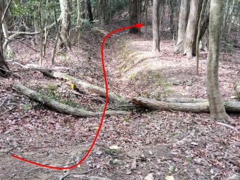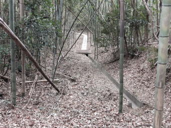 雌岡山頂上からの復路は裸石神社横から急坂を下っていく。その先に「清瀬の井(すがせのいど)」という清水が湧く井戸が現れるが見た目には濁っていてとても清水と言われる代物ではない。さらに石がゴロゴロ転がっている幅広い道を下っていくと左右に水路と思われる窪みが現れる。国土地理院の地図では実線の道と表示されているので左に折れて進んでいく。しかしその内に藪となってくる。里山はあまり人が通らなくなると藪道となってしまう。仕方が無いのでそのまま突き進んでいくとやがて別の窪み道が現れ、それを跨ぐように橋が架けられている。橋を渡るとここから先はしっかりした道となる。この山は山腹に沿って何本かの水路?が設けられているようである。